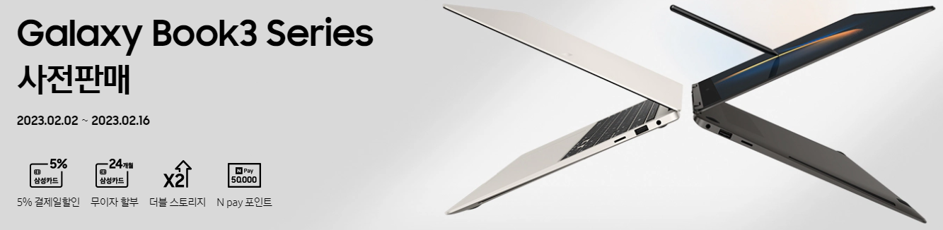 2023년 새학기를 겨냥해 출시된 갤럭시 북3 시리즈가 2023년 2월 2일부터 2023년 2월 16일까지 사전판매를 시작했습니다. 업그레이드된 스펙에 새학기 선물로 아주 적당할 것 같습니다.