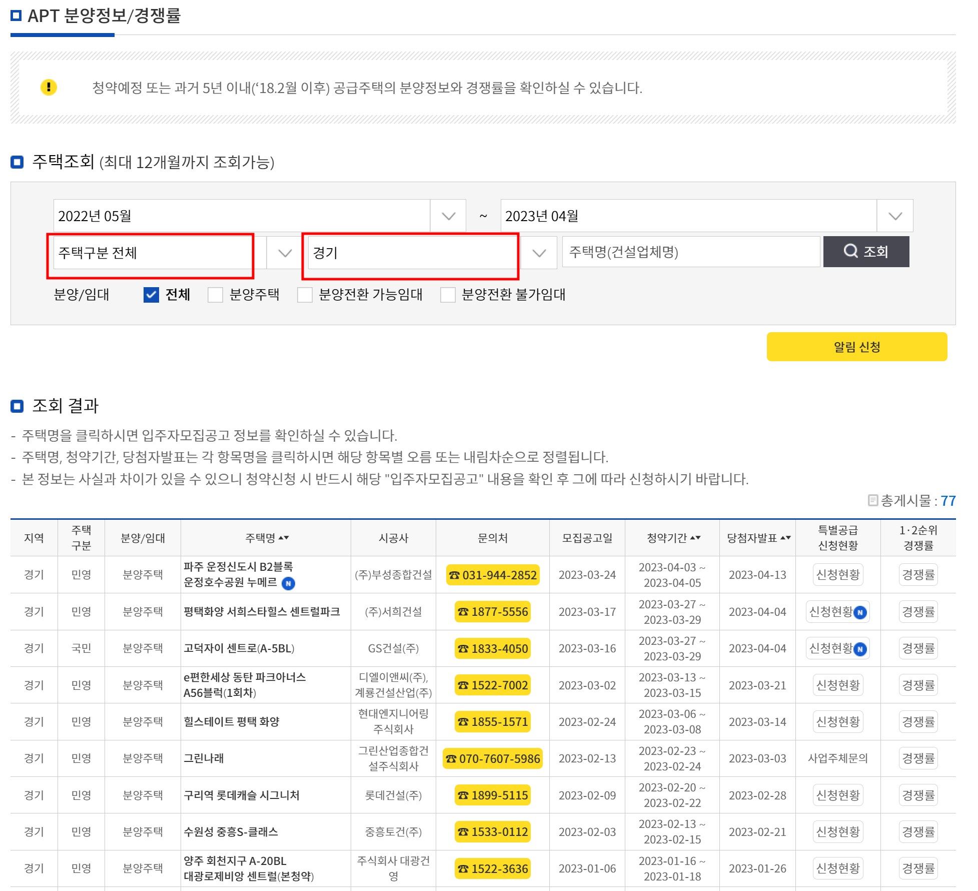 검색 후 1,2순위 경쟁률 확인
