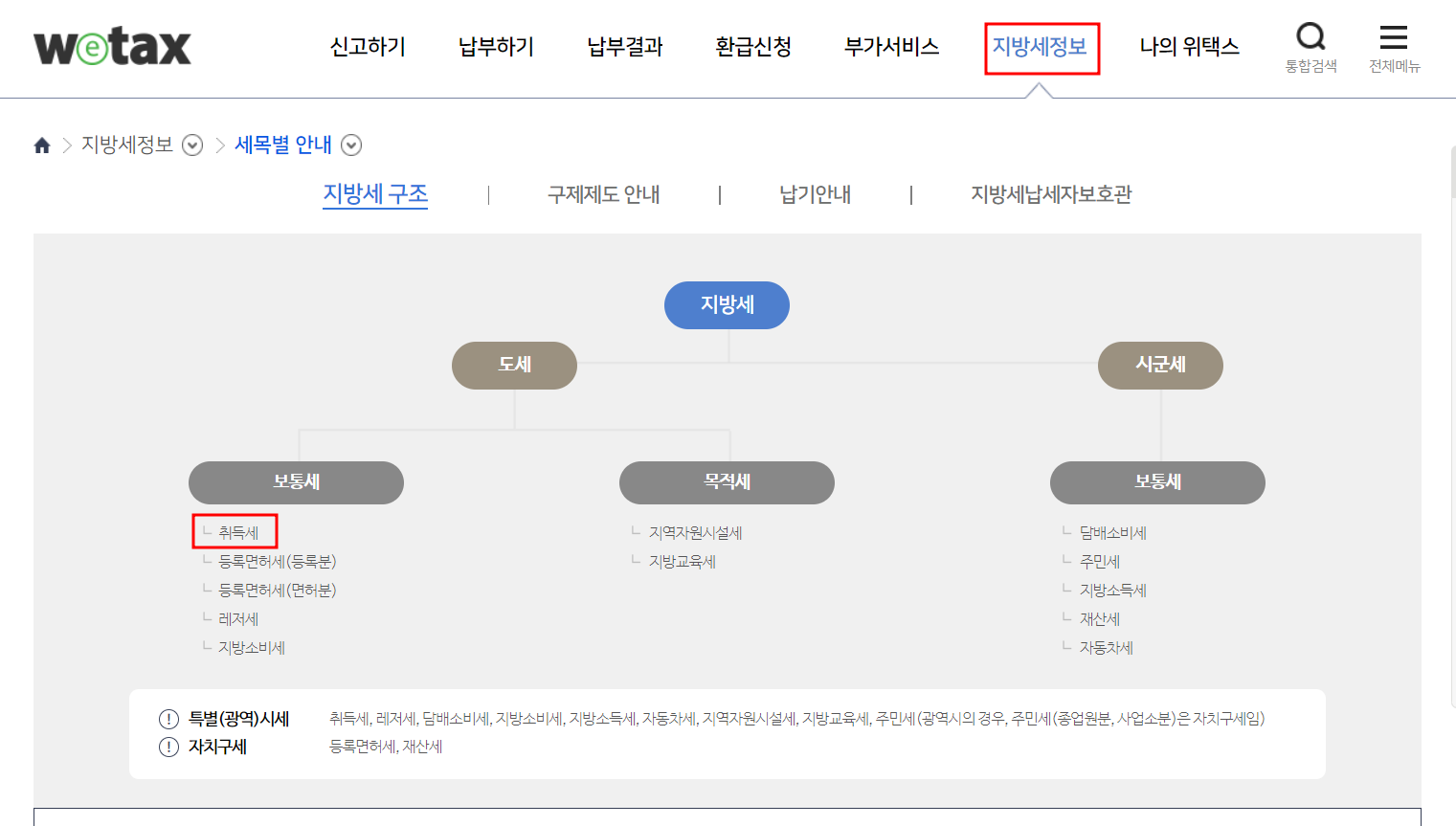 위텍스(www.wetax.go.kr)에 지방세정보>세목별안내>취득세 를 클릭해보면