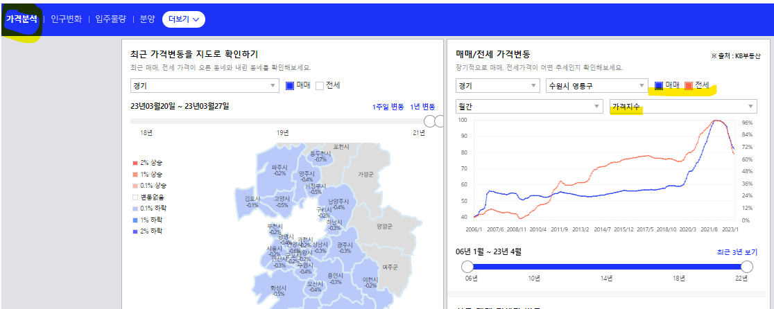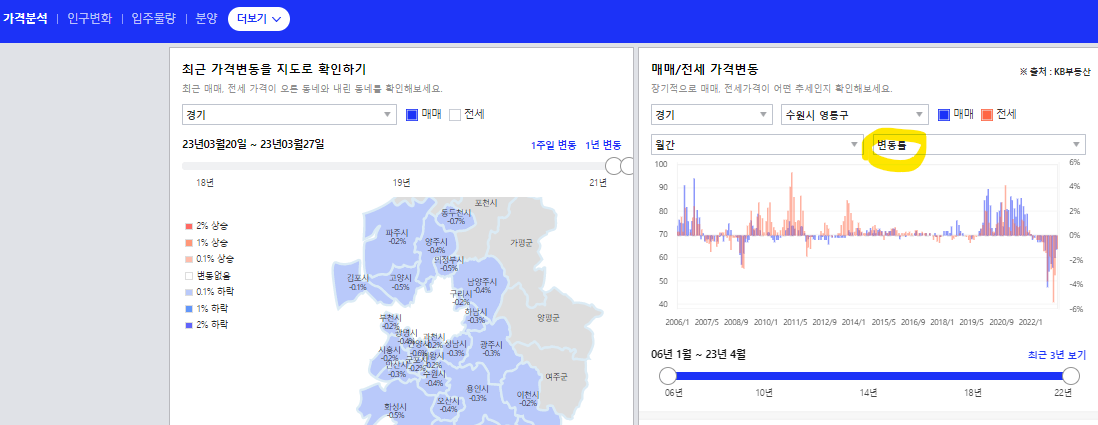 3. 가격분석 - 지역 설정 - 매매/전세 - 변동률
