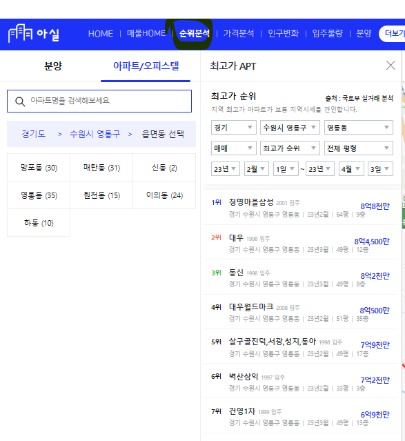 1. 순위분석 - 최고가APT - 평형 설정 (35~40평)