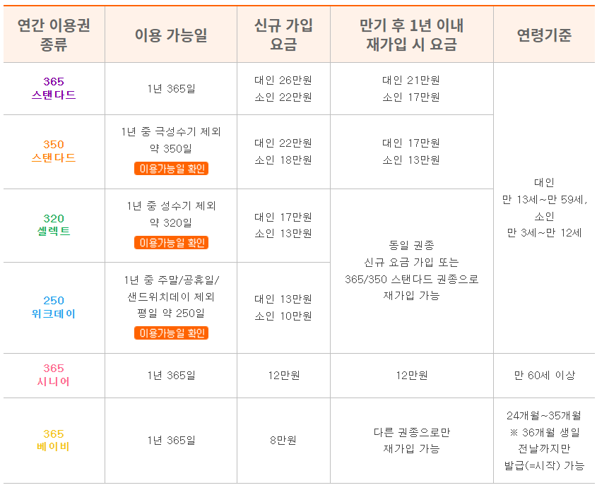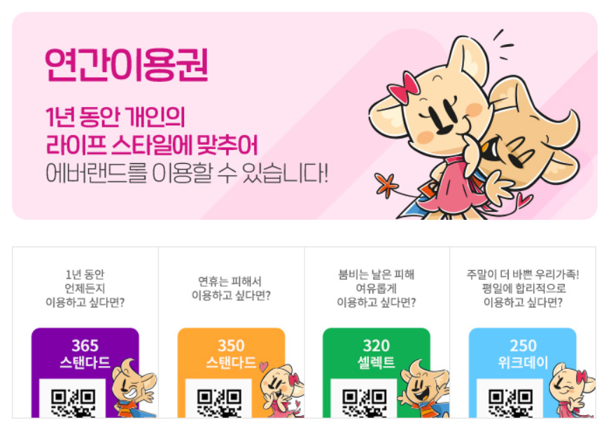 저는 연간이용권이 365 스탠다드 한 종류만 있는 줄 알았는데 알아보니 이용 제한 날짜를 며칠 정해서 그 날짜 외에 자유롭게 이용할 수 있는 이용권들이 있더라고요. 저희 가족은 어차피 사람이 몰리는 날짜는 방문하지 않으니 350 스탠다드나 320 셀렉트도 괜찮을 것 같다는 생각이 들었습니다.