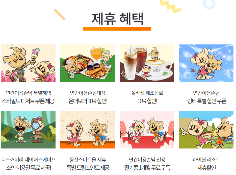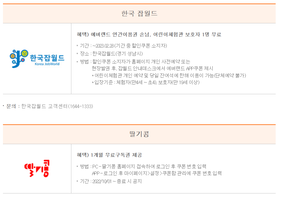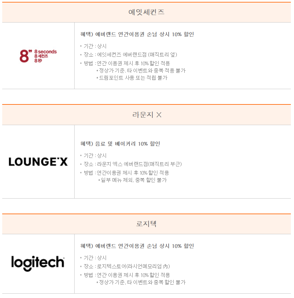 제휴 혜택 별 거 없는 것 같아보여도요. 막상 쓰면 아주 쏠쏠합니다. 저희 가족은 에버랜드 가면 에잇세컨즈에 가서 옷을 참 많이 사요. 쇼핑하러 갈 시간은 없는데 에버랜드 안에 있는 에잇세컨즈에서 옷 구매하면 할인까지 해주거든요!