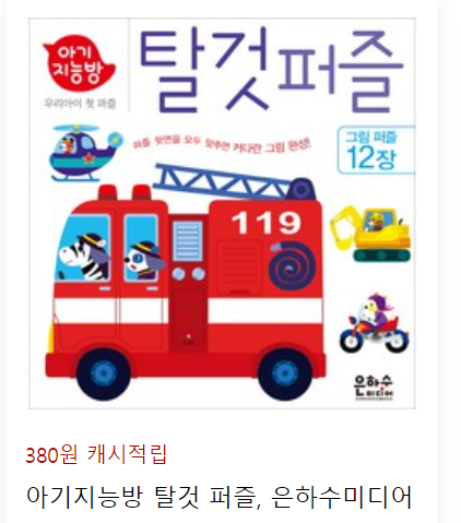 4살부터는 퍼즐 아주 강추합니다. 집중력도 길러지고 뭔가 공간지각 능력도 길러지는 것 같아요. 3살 아기는 비추예요. 잘 맞추지 못할 뿐더러 구강기가 끝나지 않은 아기들은 다 입으로 가져가거든요.